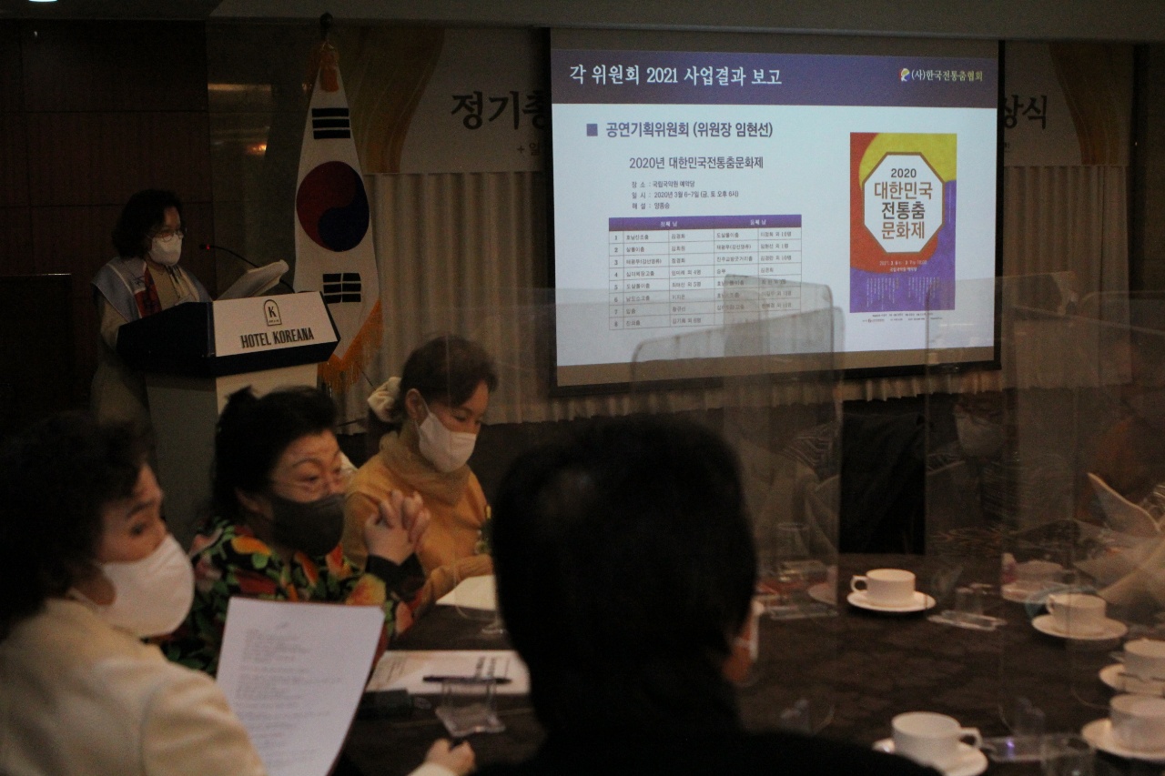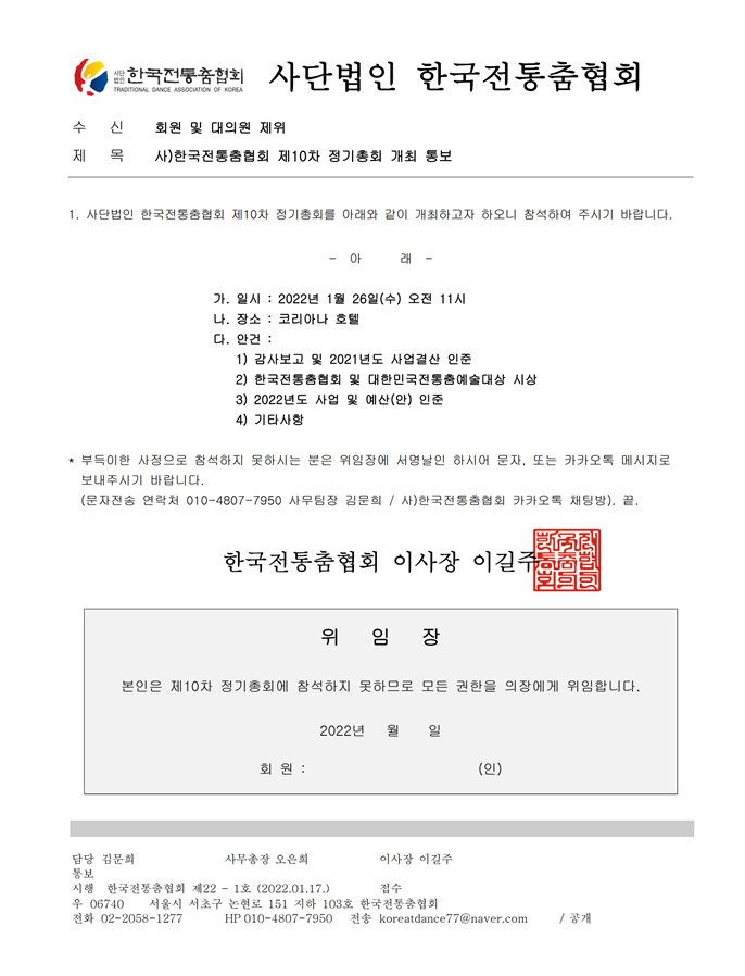 가. 일시 : 2022년 1월 26일(수) 오전 11시나. 장소 : 코리아나 호텔 7F다. 안건 : 1) 감사보고 및 2021년도 사업결산 인준 2) 한국전통춤협회 및 대한민국전통춤예술대상 시상 3) 2022년도 사업 및 예산(안) 인준 4) 기타사항